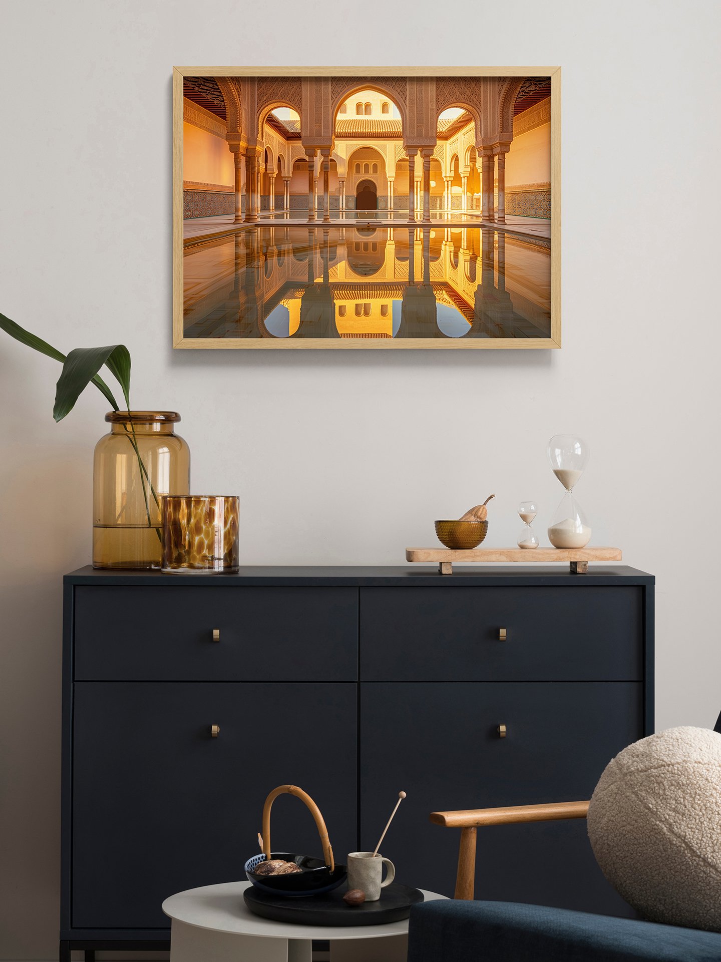The image depicts the interior of the Alhambra Palace, where arches, columns, and a pool intertwine. Sunlight filters through, casting light and shadow across the architecture and water. Blue-and-white tiles contrast with warm golden stone columns, showcasing the palace’s exquisite and tranquil Islamic design.