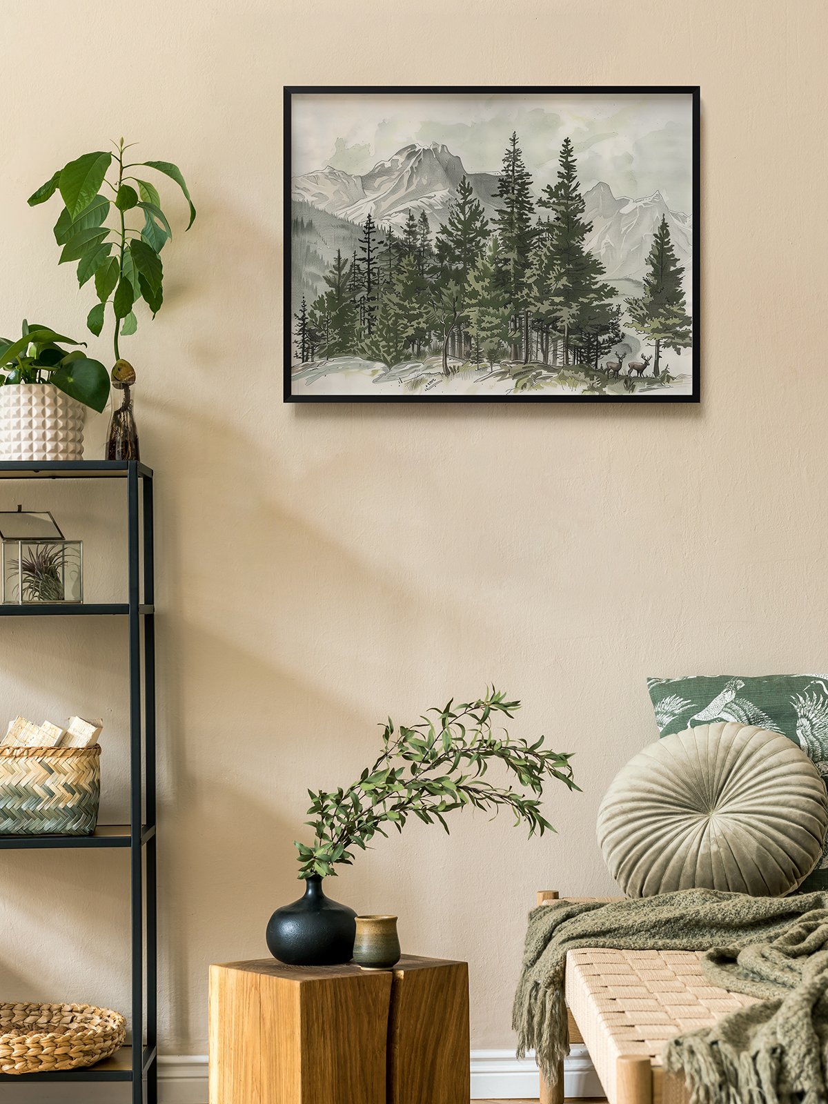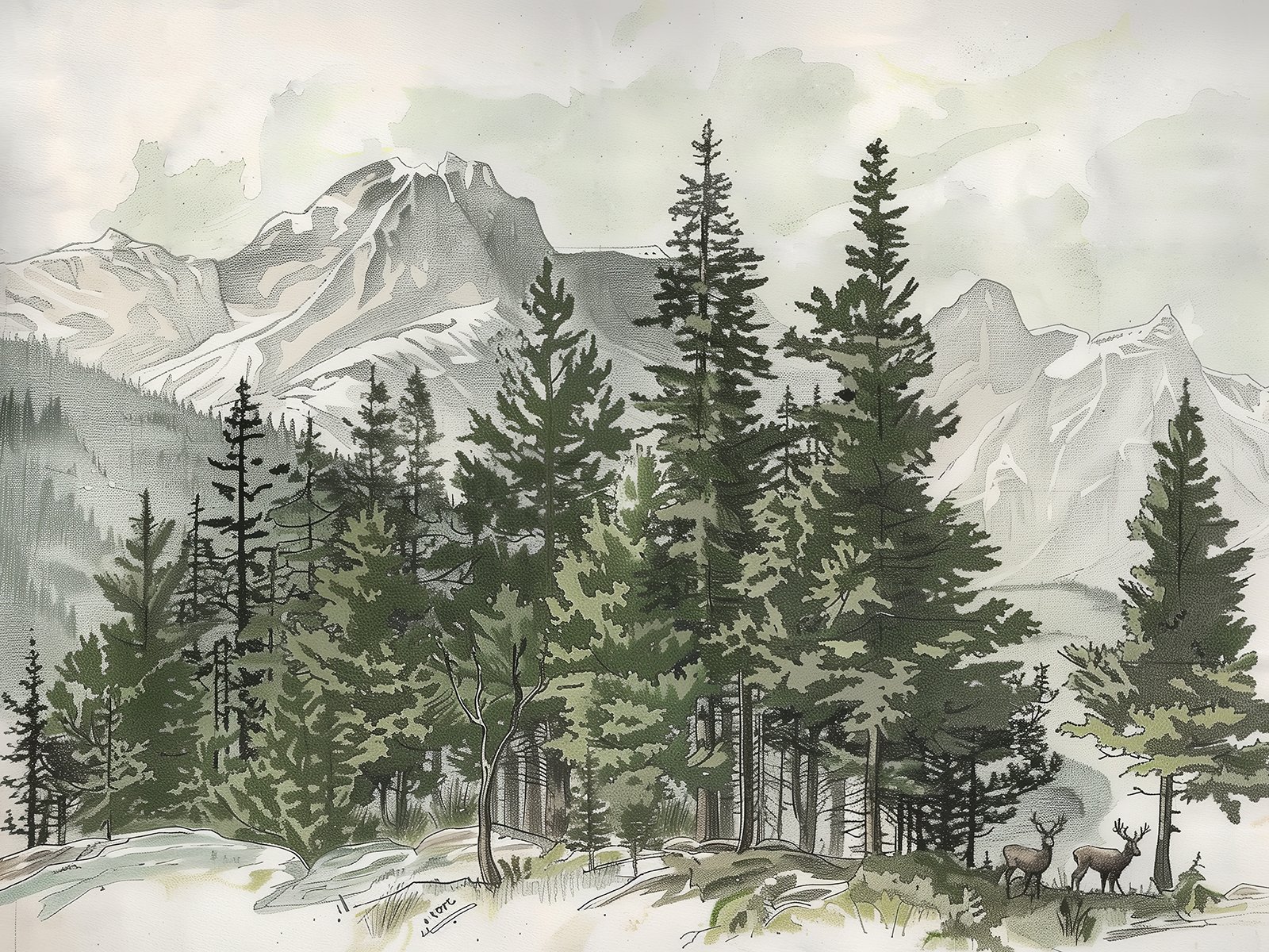 This painting depicts a dense pine forest with towering mountains in the background and a few antelopes strolling through the woods. The scene is filled with tranquility and natural harmony, giving a sense of peace away from the hustle and bustle.
