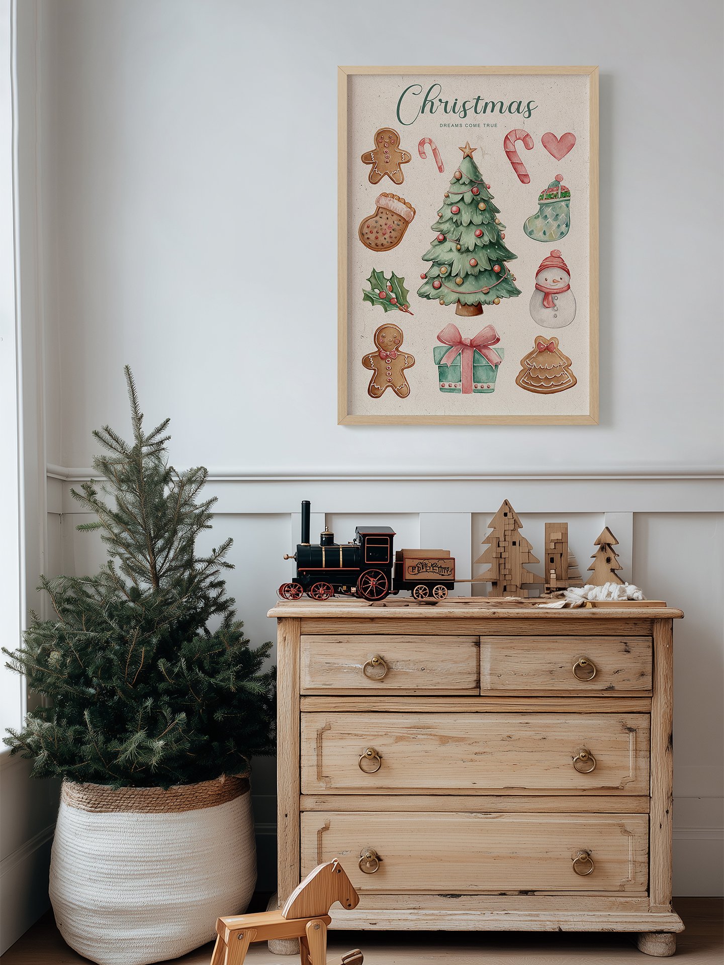 At the center stands a Christmas tree adorned with colorful ornaments and a shining star. Around it are gingerbread cookies, candy canes, stockings, a snowman, and a gift box. The soft, warm colors create a joyful festive atmosphere, like stepping into a Christmas fairytale.