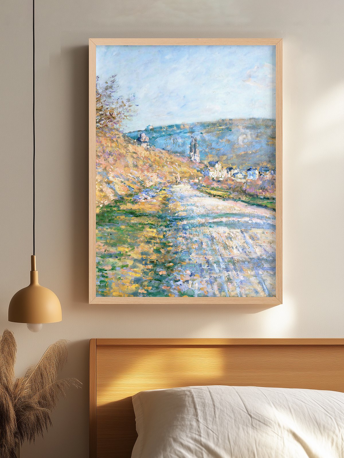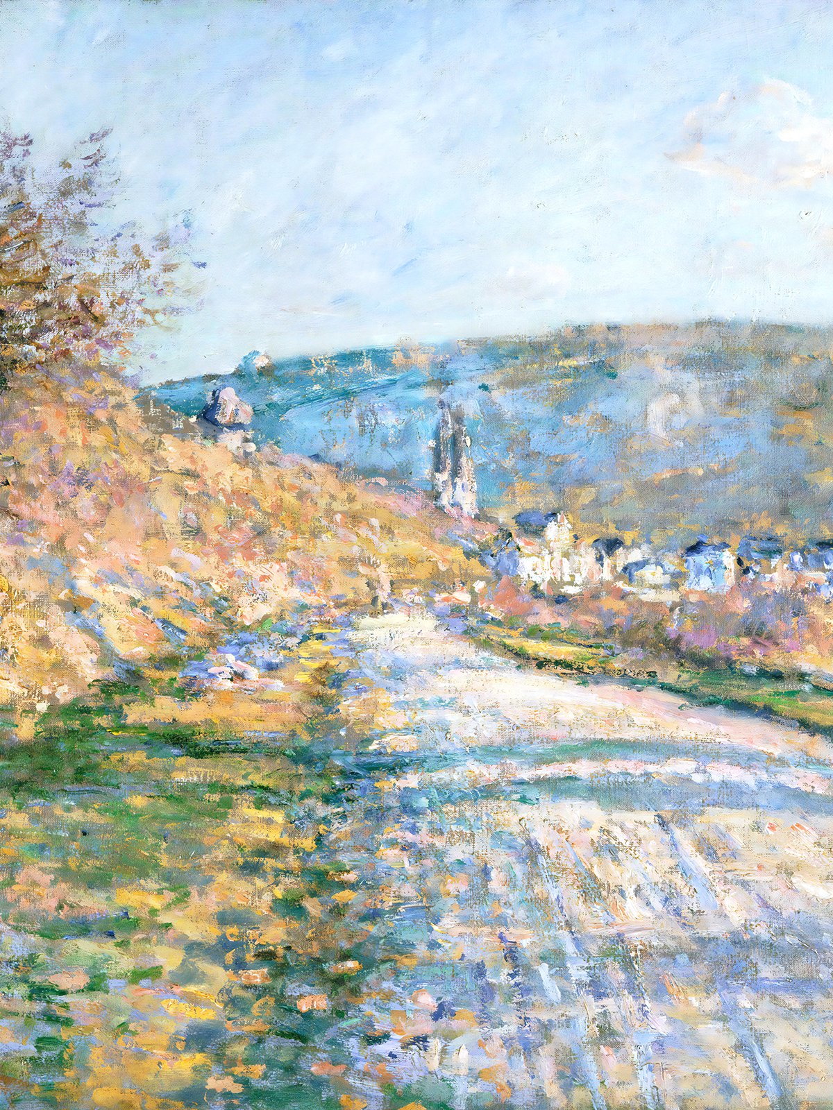 Monet’s “The Road to Vétheuil” depicts a winding country road flanked by blooming flowers and lush trees, with the village of Vétheuil faintly visible in the background. The soft tones and fluid brushstrokes convey a serene and peaceful rural scene, giving a sense of calm and leisure.