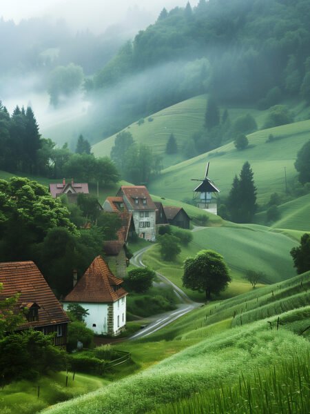 Colorful buildings stand out against the blue sky, and the contrast of blue windows and orange-yellow walls evokes Mediterranean romance. In the distance, the sea and sky merge, and boats and the majestic church complement each other, creating a serene atmosphere. The lively street is dotted with flowers and greenery, adding warmth and romance.