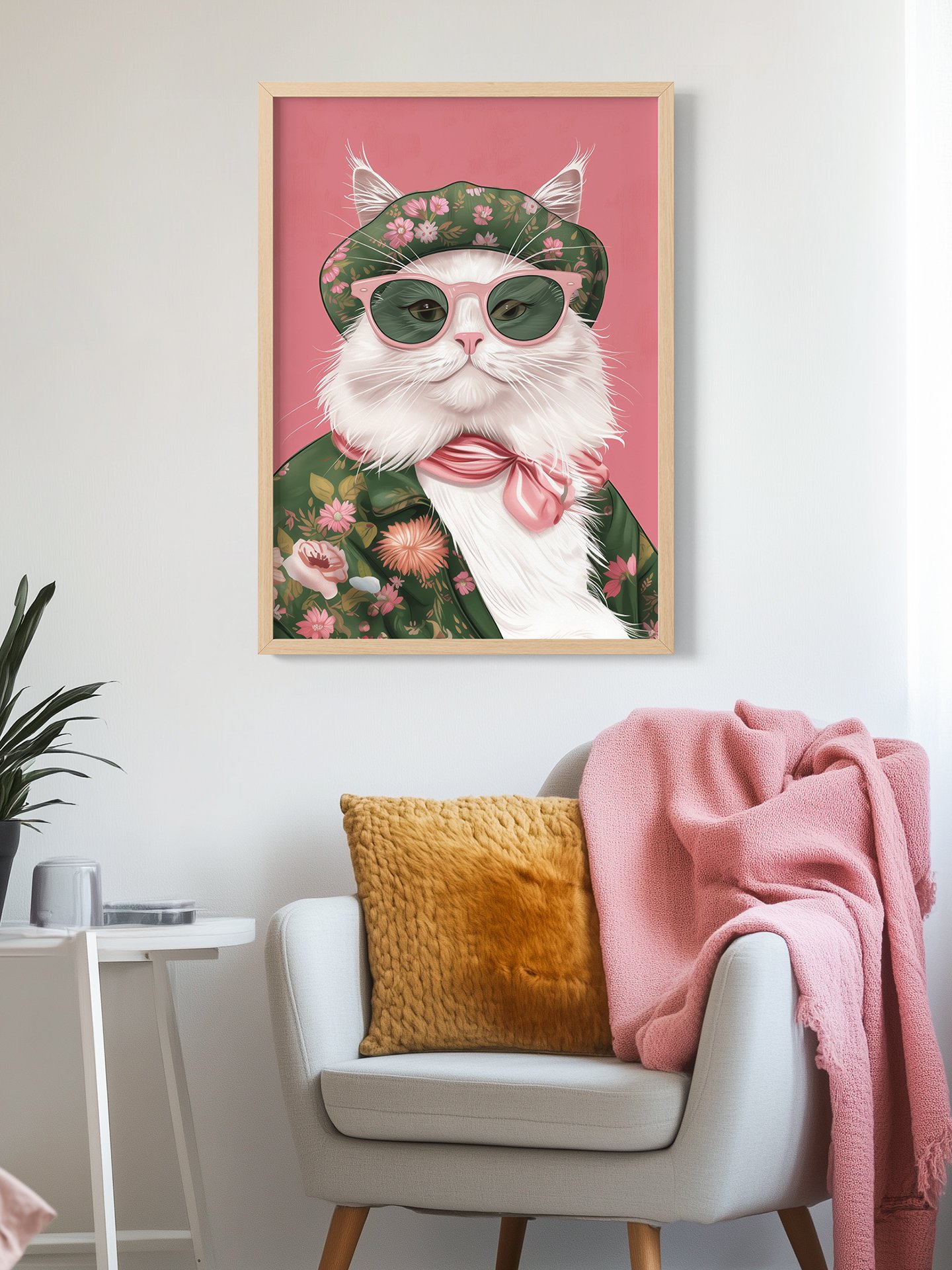 In the picture, a white cat is full of fashion sense. It wears a green floral – patterned beret, pink sunglasses, a green floral – patterned top, and a pink bow – tie. The soft pink background makes it look extremely cute and playful.