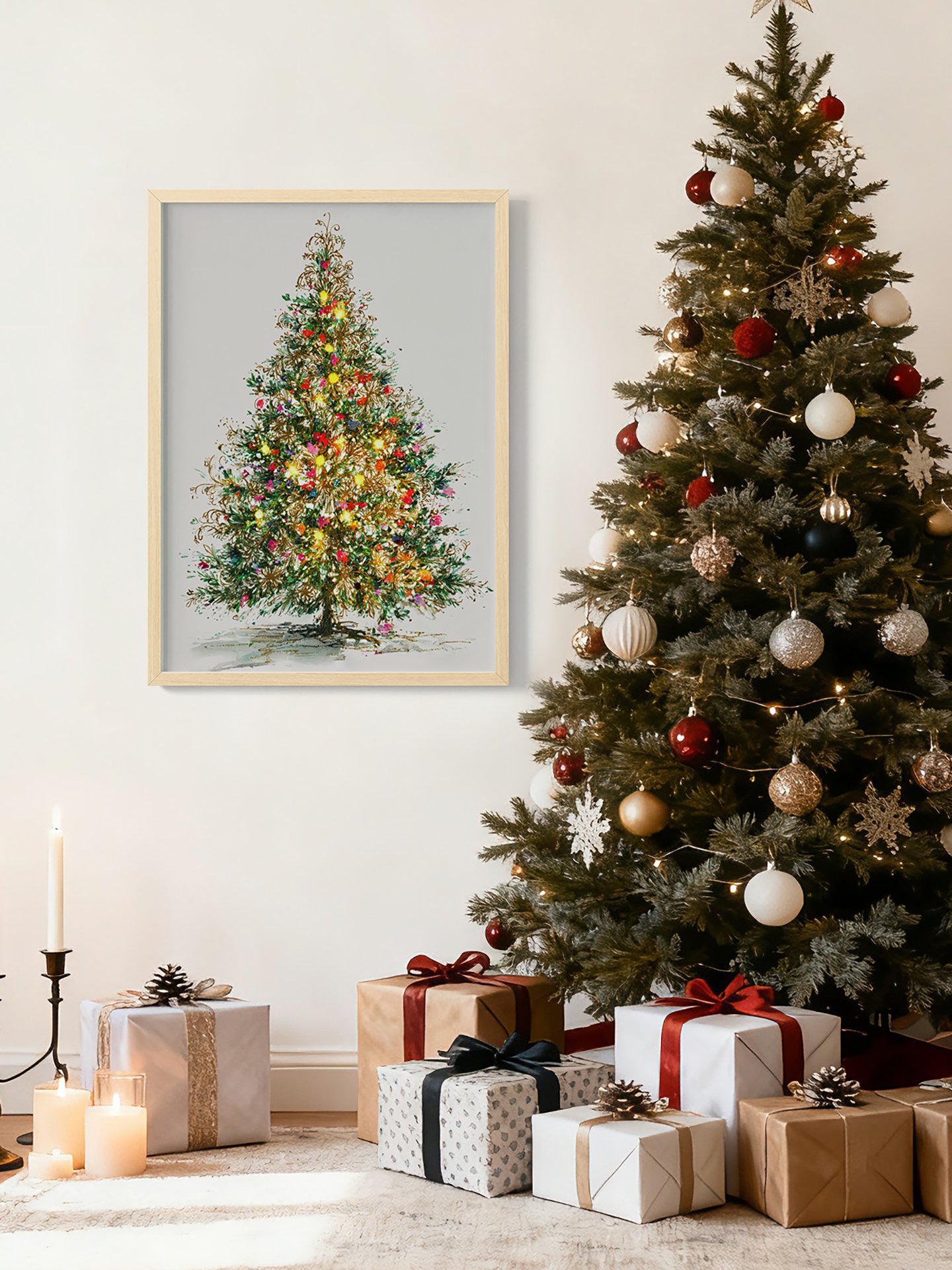 This artwork portrays a magnificent Christmas tree adorned with colorful lights and floral-like ornaments. Golden strokes create intricate and elegant patterns, making the tree shine with warmth and festivity. The scene conveys a dreamy and joyous holiday spirit full of hope.