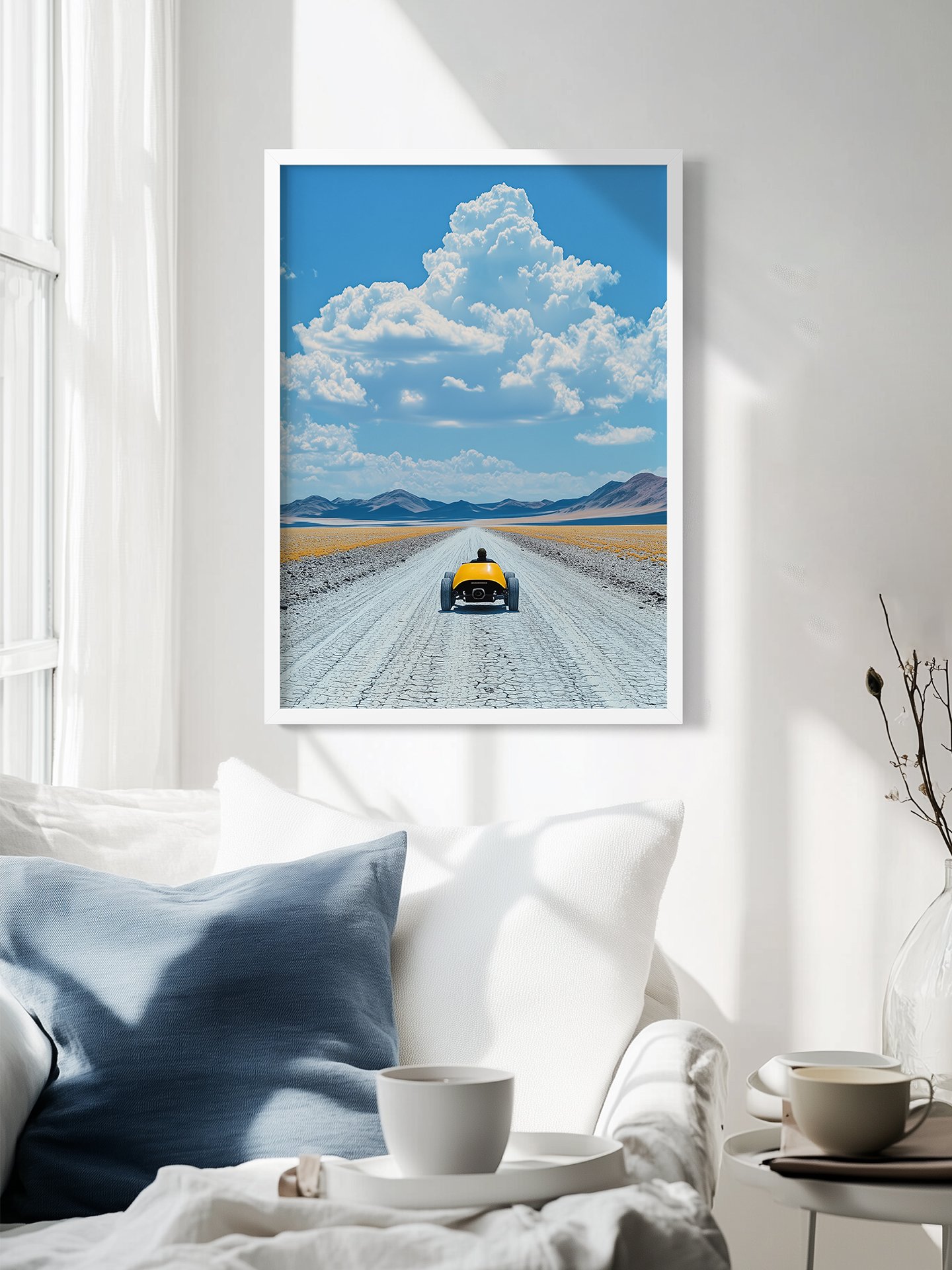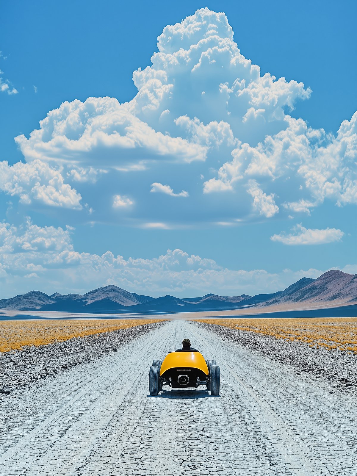 A small yellow car drives along a straight desert road beneath towering white clouds. The vast land and endless sky create a quiet yet powerful sense of freedom, solitude, and the desire to journey forward into the unknown.