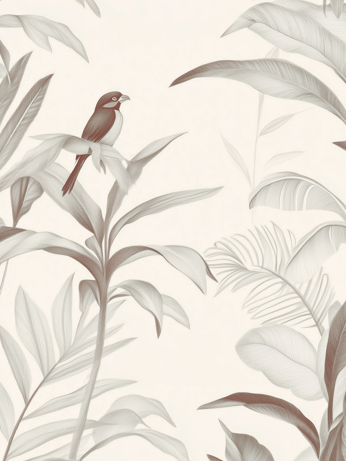 A lone bird perches quietly amidst softly sketched tropical foliage. The composition exudes stillness and balance, as if time has gently slowed.