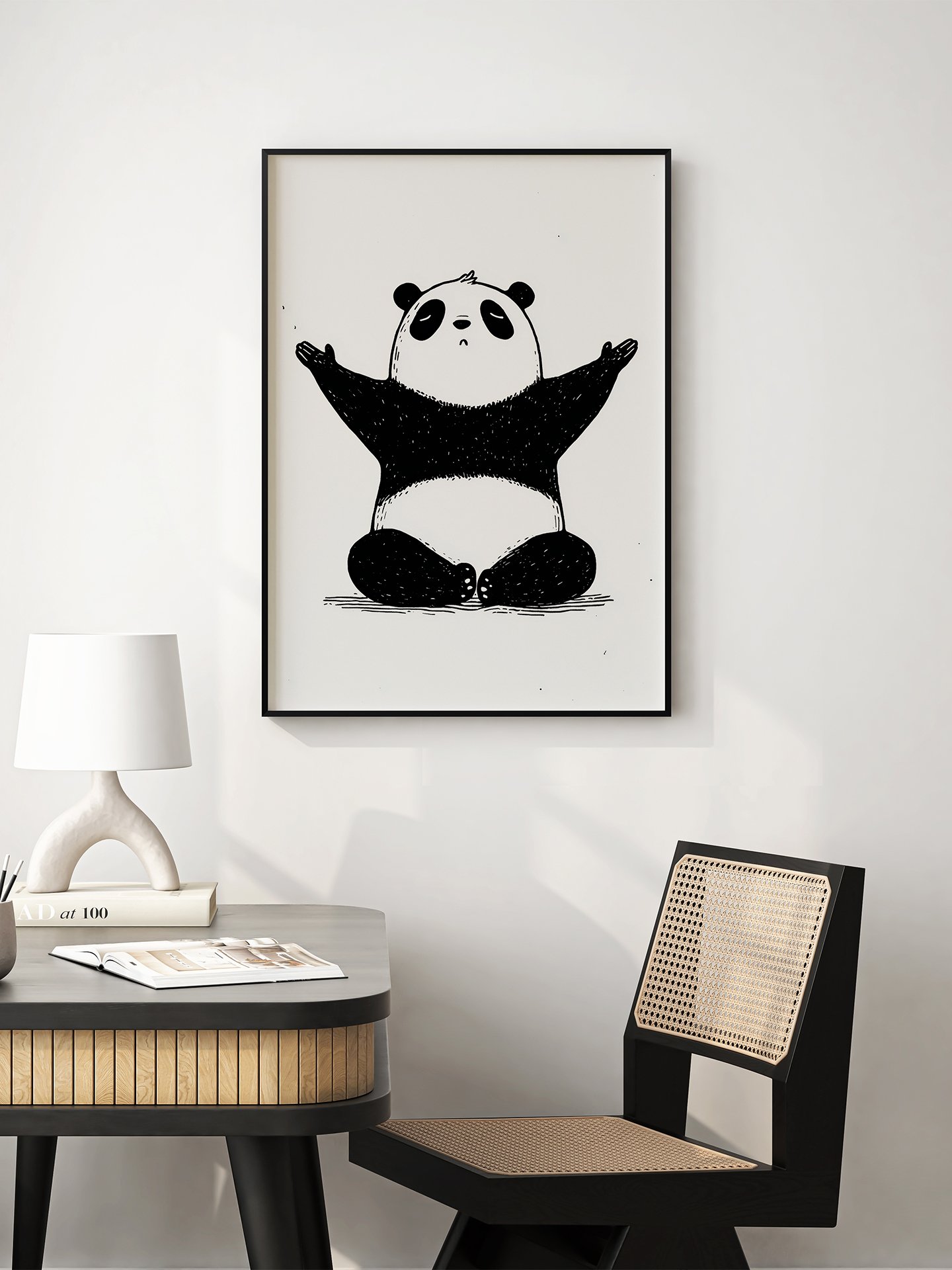 The panda sits calmly with arms open, eyes soft and peaceful. Clean black-and-white lines and generous negative space create a tranquil mood, inviting stillness, balance, and a gentle pause from daily life.