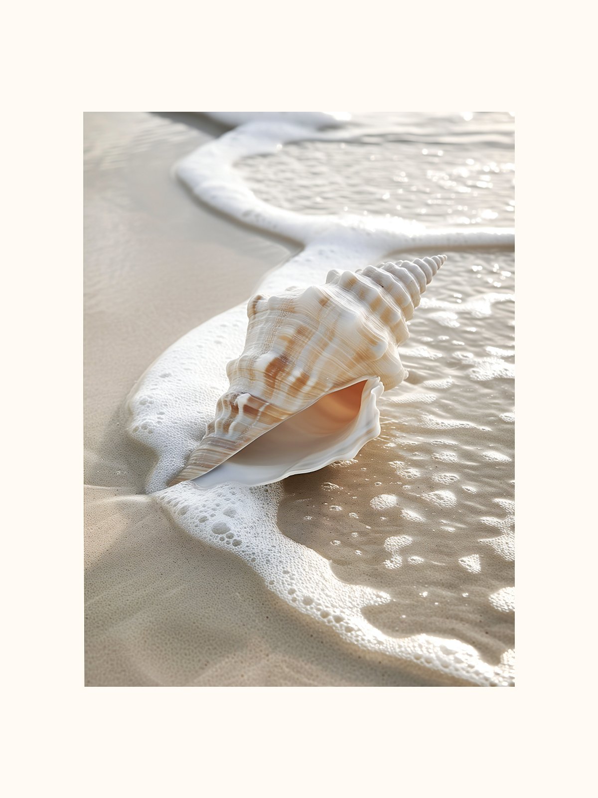This photograph showcases a beautiful seashell resting quietly on the beach, with gentle waves caressing the shell and the sand. The shell’s delicate texture and soft colors perfectly blend with the natural hues of the sea and the beach. Sunlight glistens on the shell and the foam, reflecting a warm glow that adds a sense of coziness to the image. The entire scene is tranquil and beautiful, evoking a sense of purity and peace found in nature.