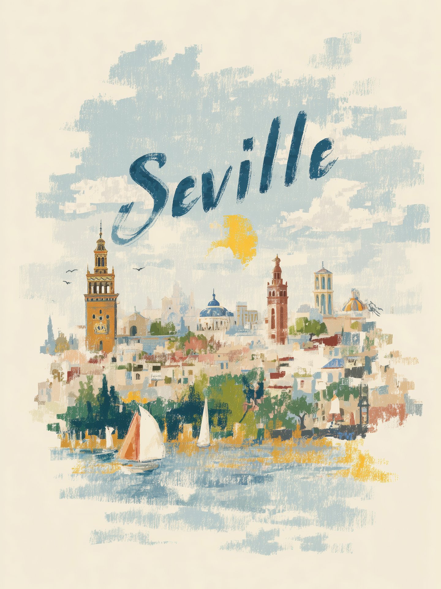 The watercolor – style painting depicts Seville, with towering buildings and colorful architecture under a blue sky, boats on the water, and green trees, creating a tranquil and far – reaching atmosphere.