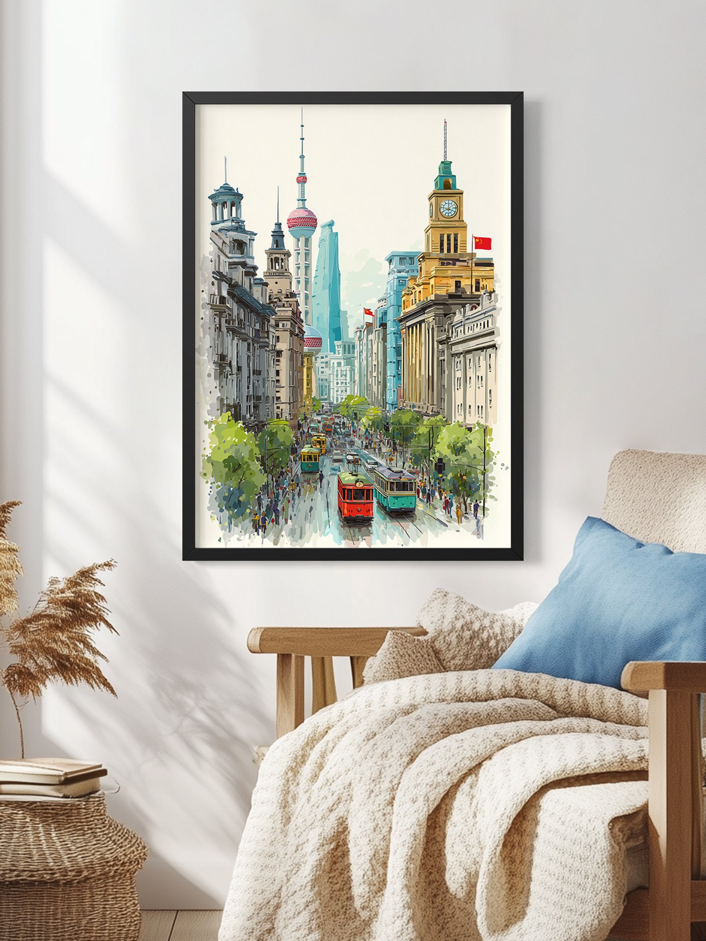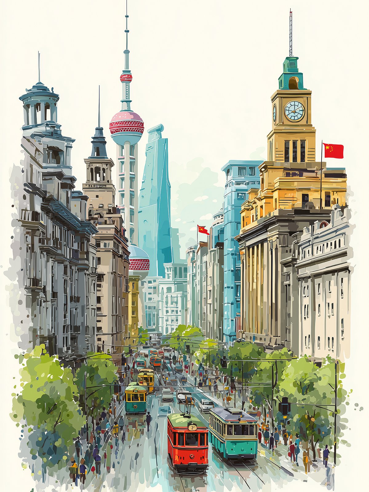 The artwork captures a Shanghai street scene where trams move between historic buildings and modern skyscrapers. Daily life flows calmly yet confidently, blending old Shikumen charm with the city’s forward-looking, cosmopolitan spirit.