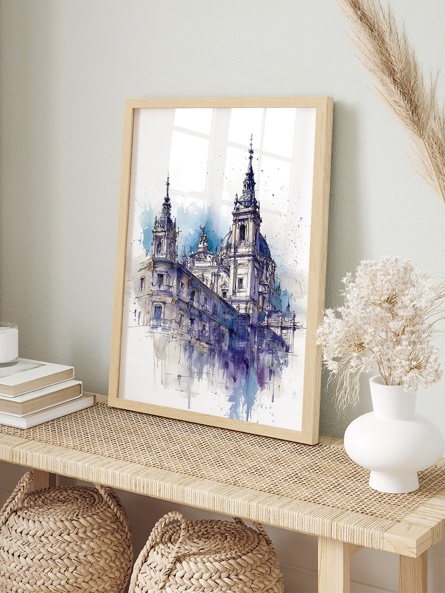 Plaza de Cibeles is portrayed with brushstrokes as light as watercolor. Towers and domes sparkle amid the interplay of light and shadow. The weight of stone merges with the fluidity of art, forming an urban symphony that resounds with the grandeur of Spain’s unique rhythm.