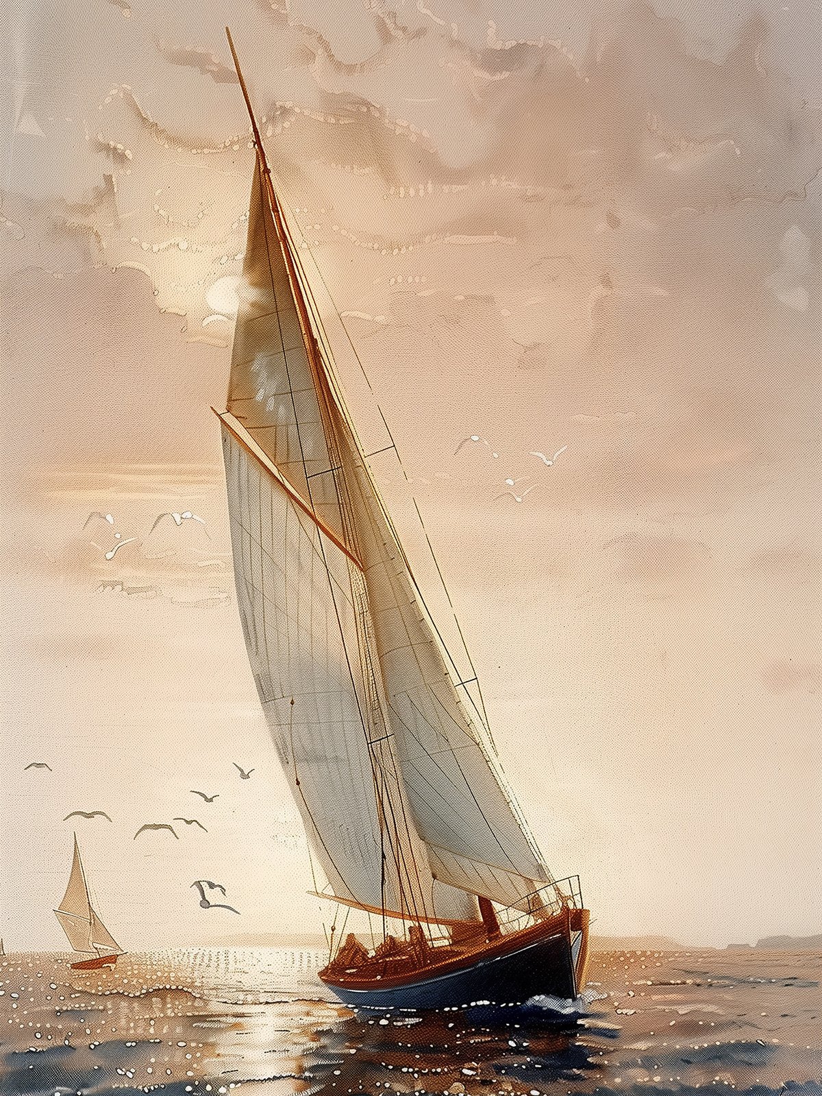 In the picture, The afterglow of the sunset fills the sea, a sailboat sets sail, the orange sky contrasts with the deep blue sea, and seagulls fly with it. Silence and harmony are intertwined, forming a peaceful sunset seascape that is intoxicating.