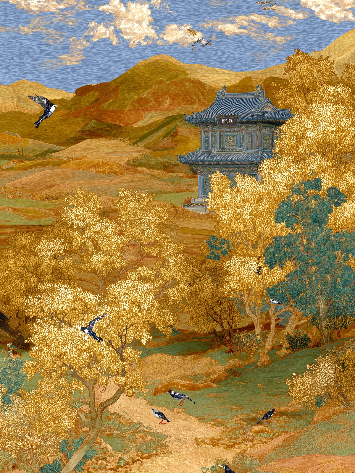 Golden autumn trees fill the hills as a quiet temple stands in the distance. Birds glide through the sky, and warm earthy tones blend with soft greens, creating a peaceful, timeless atmosphere full of calm and reflection.