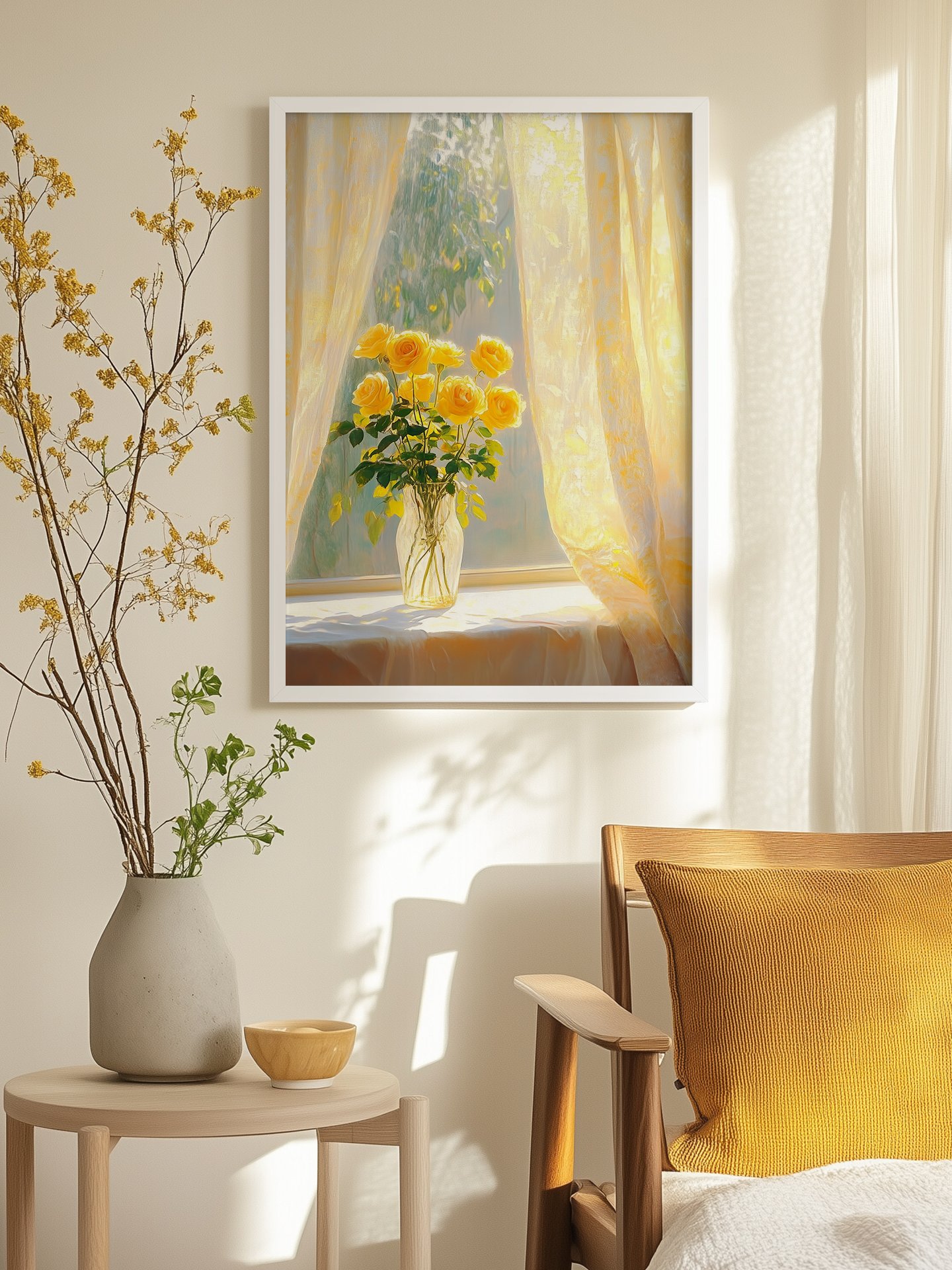 On the windowsill, bright yellow roses are in a transparent vase. Sunlight streams in through the soft curtains, creating a play of light and shadow. The yellow roses look especially vivid in the sunlight, creating a warm and beautiful atmosphere, adding a touch of romance to the home.