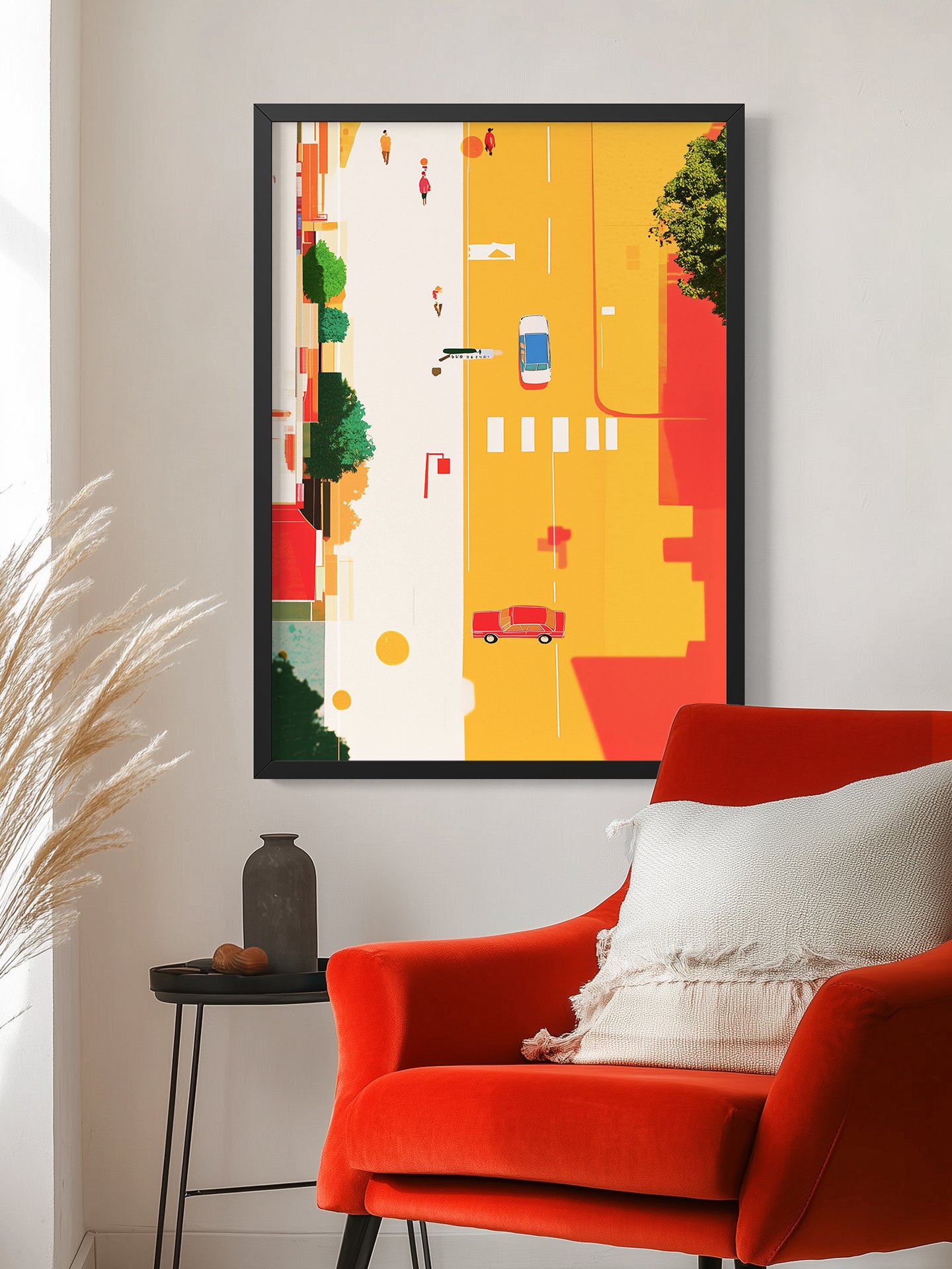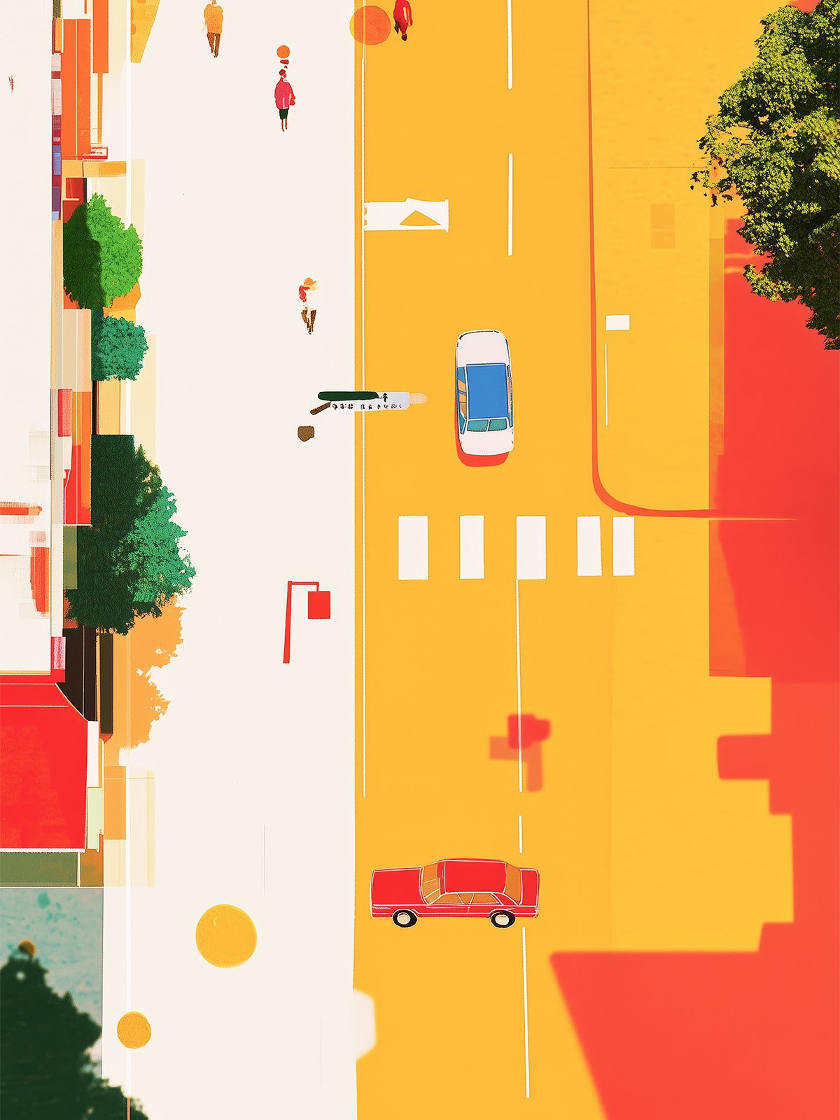 Seen from above, the city street unfolds in warm yellows and reds. Cars and pedestrians move calmly through the light, creating a rhythmic, minimal scene that celebrates everyday urban life and gentle motion.