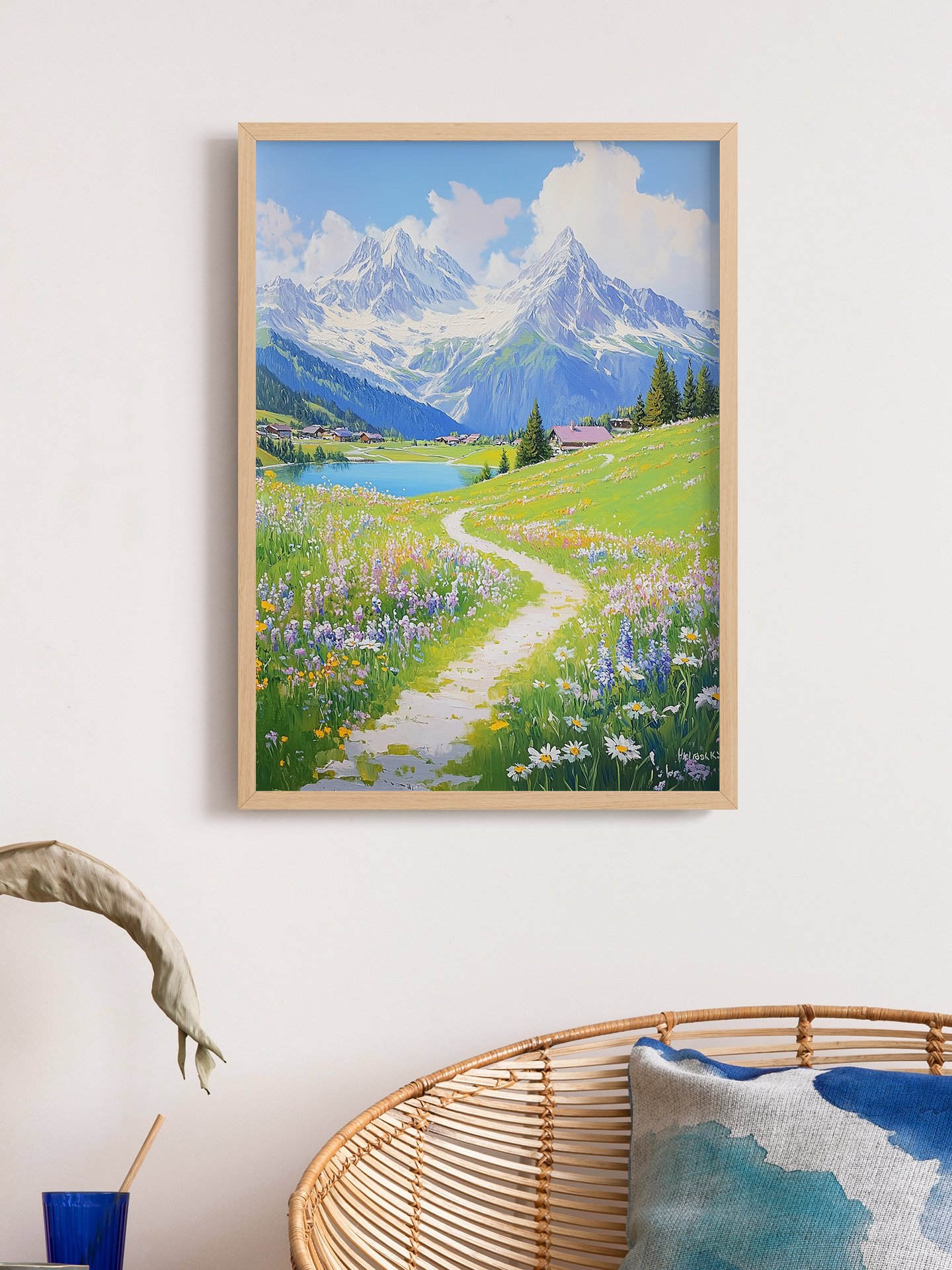 ‌The picture shows a beautiful natural landscape. In the foreground are flower – filled meadows and a winding path. In the middle ground are a lake, houses, and trees. In the distance are majestic snow – capped mountains. The fresh colors create a peaceful and leisurely atmosphere, adding natural beauty to the home.