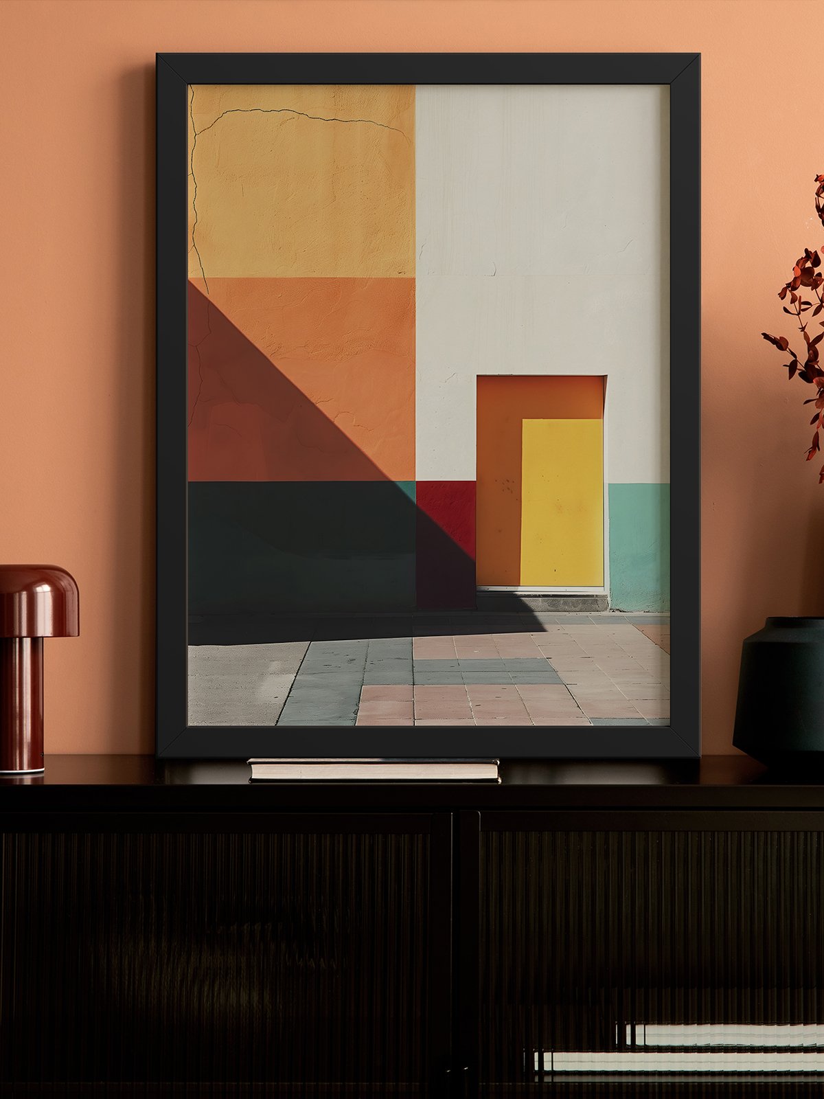 This painting features a wall rich in colors, with geometric divisions creating a sense of order. The blocks of orange, yellow, red, and green blend together, forming a vibrant and contemporary artwork. The simple composition and strong color contrasts provide a visually striking and pleasing experience.