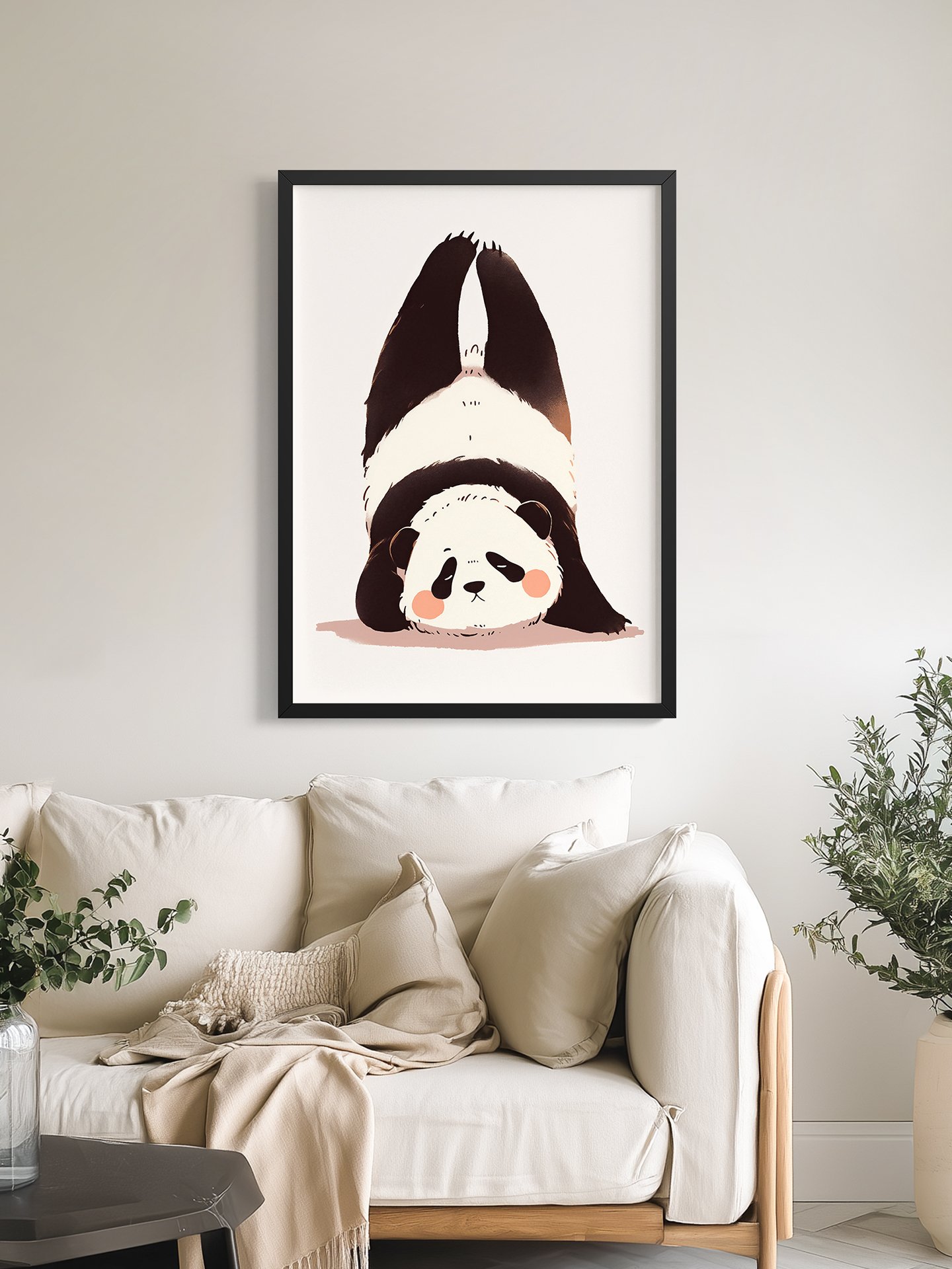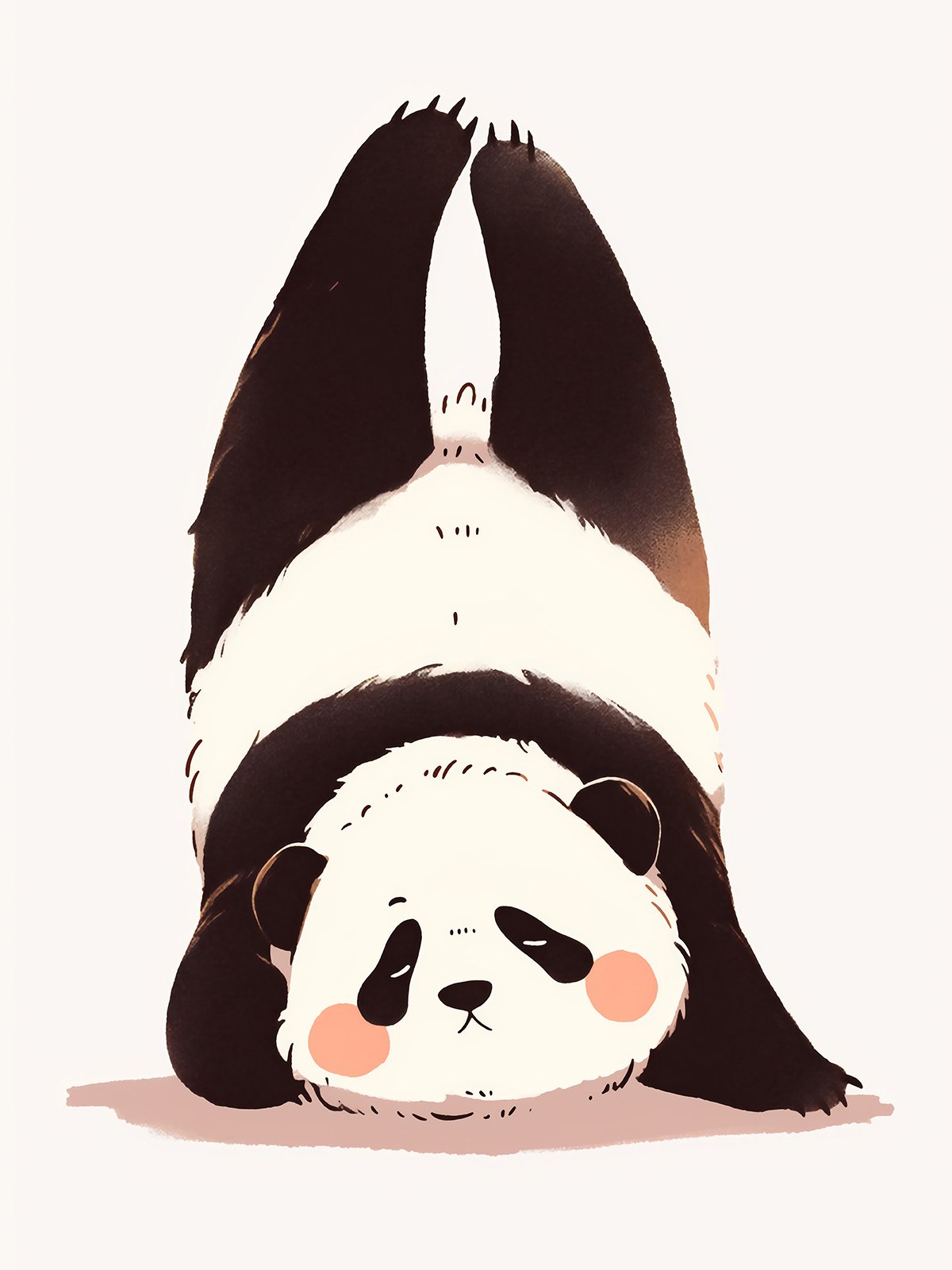 A chubby panda holds a gentle upside-down pose, cheeks softly blushed. Minimal lines and open space create a light, playful balance, expressing calm, mindfulness, and a quiet sense of humor.