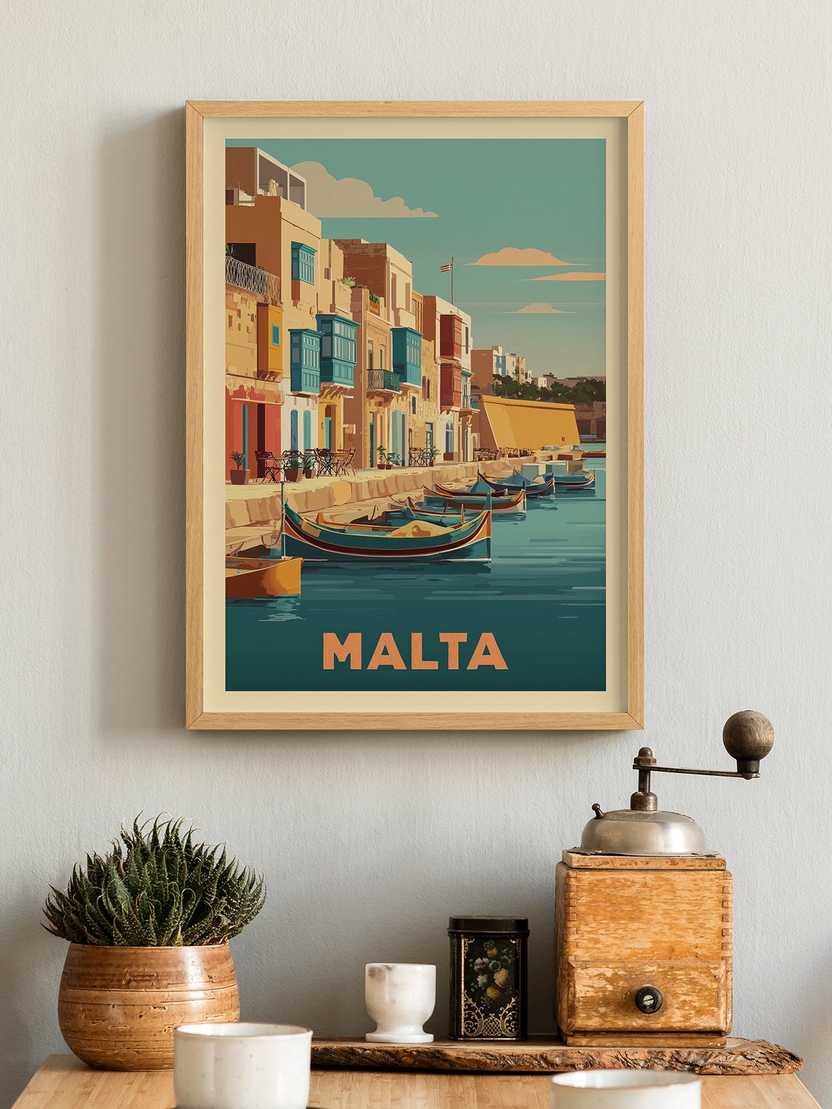 Colorful balconies and stone houses line the waterfront, their reflections painting the harbor anew. Fishing boats rest along the shore, embodying Valletta’s unique rhythm of life and maritime spirit.