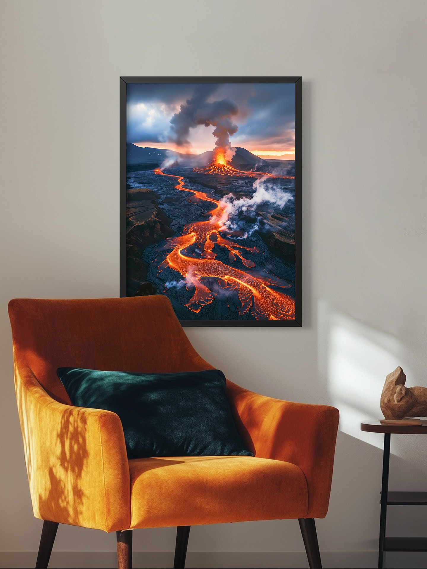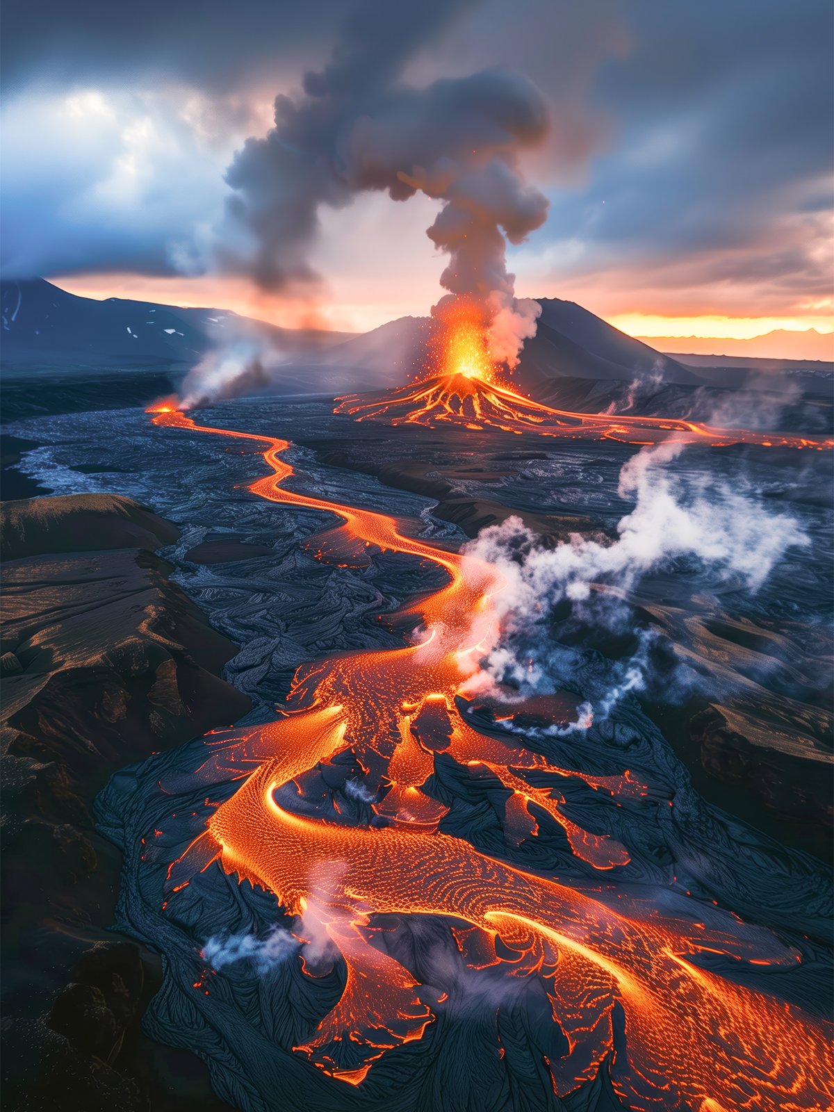 Molten lava glows like fire, winding across dark land toward the erupting volcano. Smoke billows into the sky, creating a powerful scene of raw energy and awe-inspiring beauty.