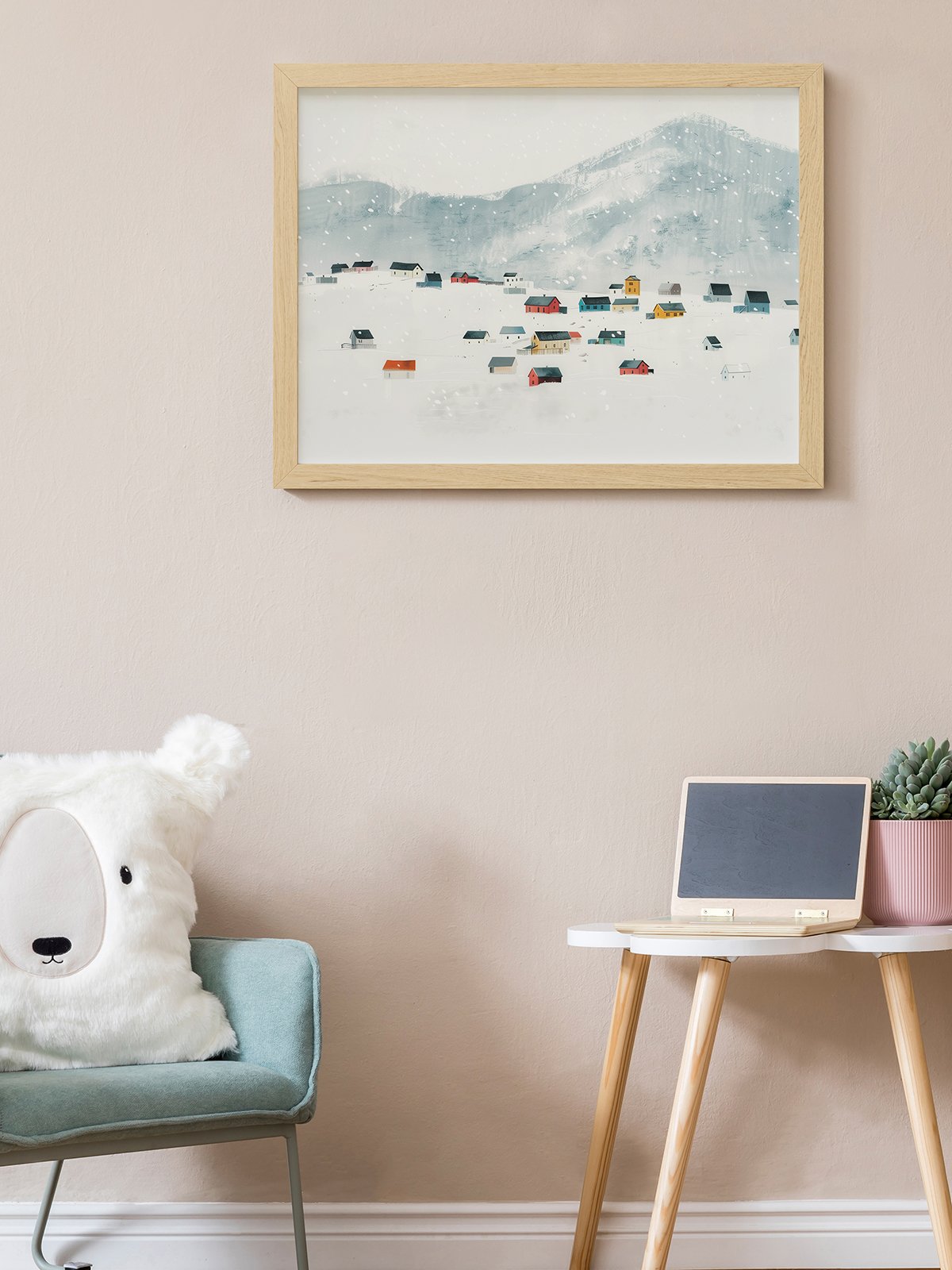 This image depicts a tranquil snowy scene with colorful houses scattered on a snow-covered hillside. The scene is fresh and gives a sense of peace and serenity, as if you can hear the gentle sound of snowflakes falling.